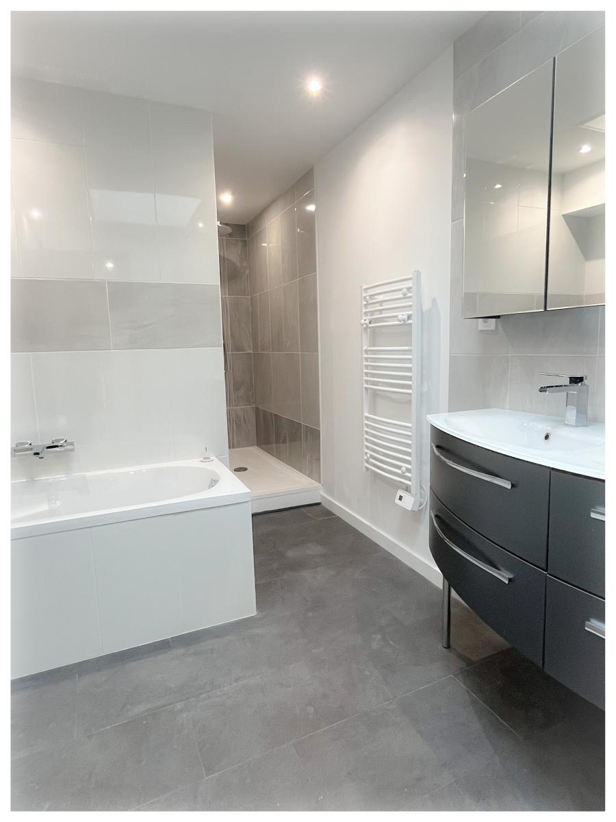 Au 1er étage trois chambres dont une de 40m2 avec sa salle de douches et WC. Un stationnement, un garage, et une cour privative complète l'ensemble.